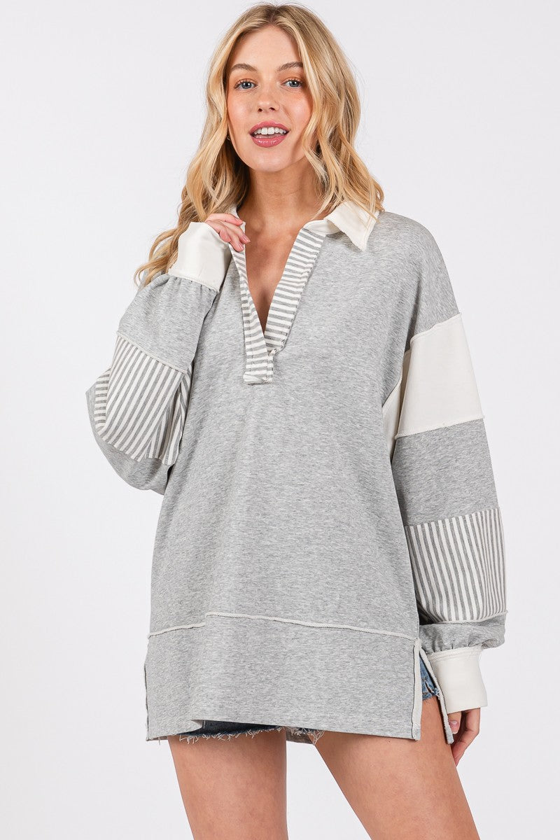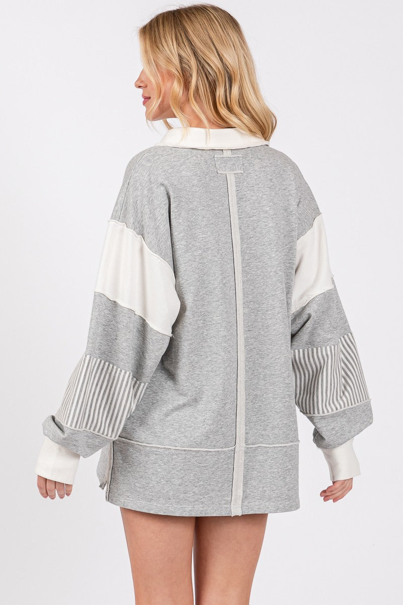 Elevate your game day style with the Grey Stripe Pullover 1847. This oversized pullover features striking blue and white contrast panels complemented by preppy striped accents on the collar and...