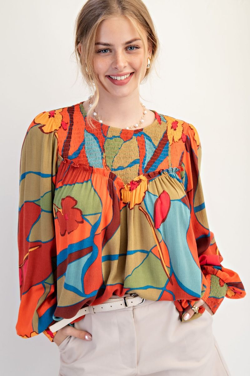 Embrace effortless elegance with this floral printed rayon gauze dress. Featuring long bishop sleeves with smocked cuffs and a ruffled, smocked V-neckline, it offers delicate, feminine details. The tiered and...