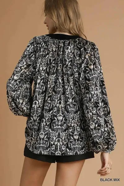 Experience the luxurious feel of the Velvet Jacquard Boho Blouse, featuring a soft velvet blend that drapes effortlessly. Its deep V-neck trimmed with solid velvet adds a refined edge, while...