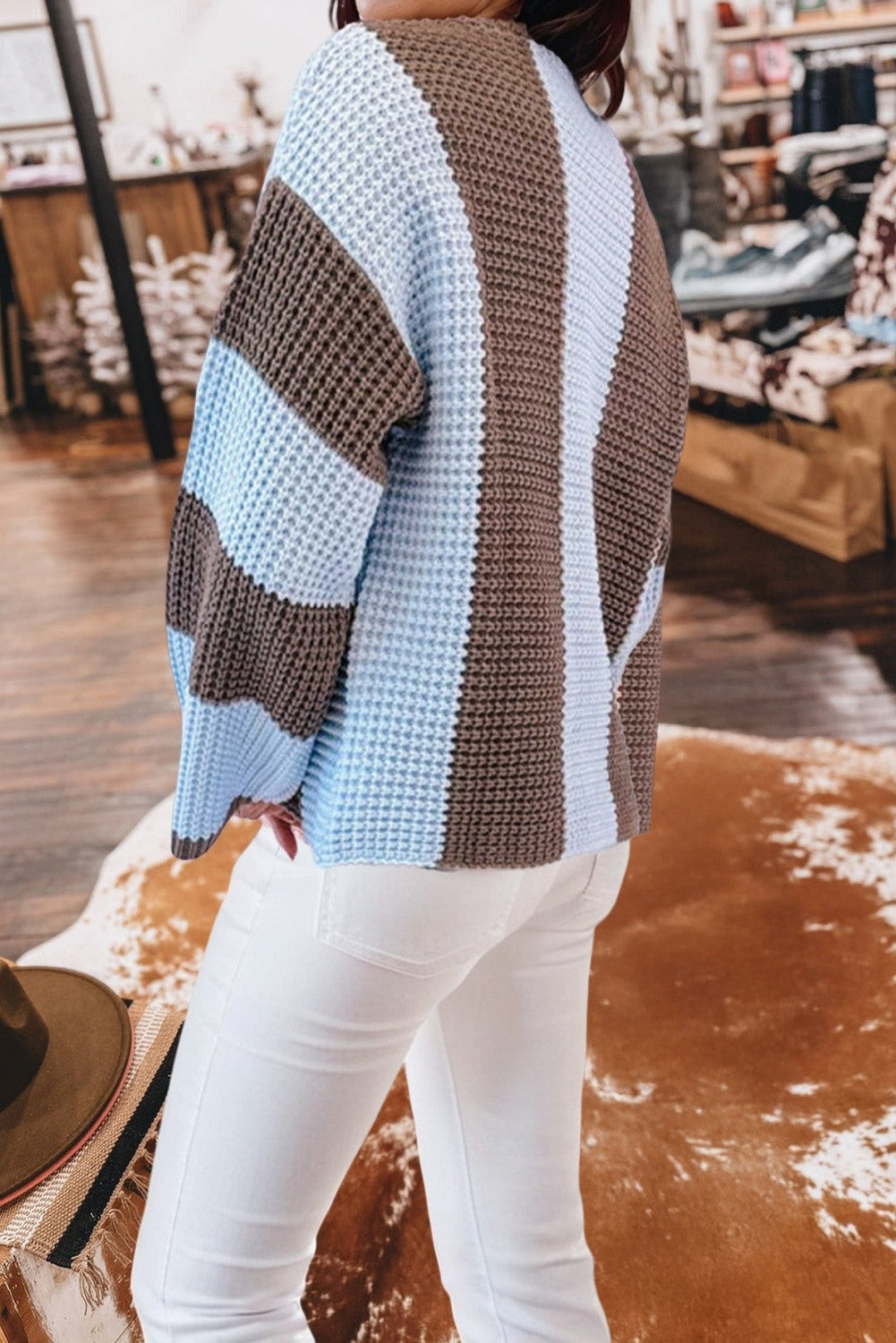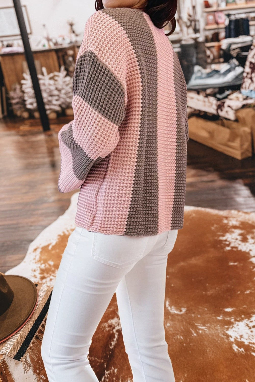 Discover the perfect sweater that combines comfort with undeniable style. This rust and cream striped design features a flattering v-neck and statement 3/4 balloon sleeves that add movement and dimension...