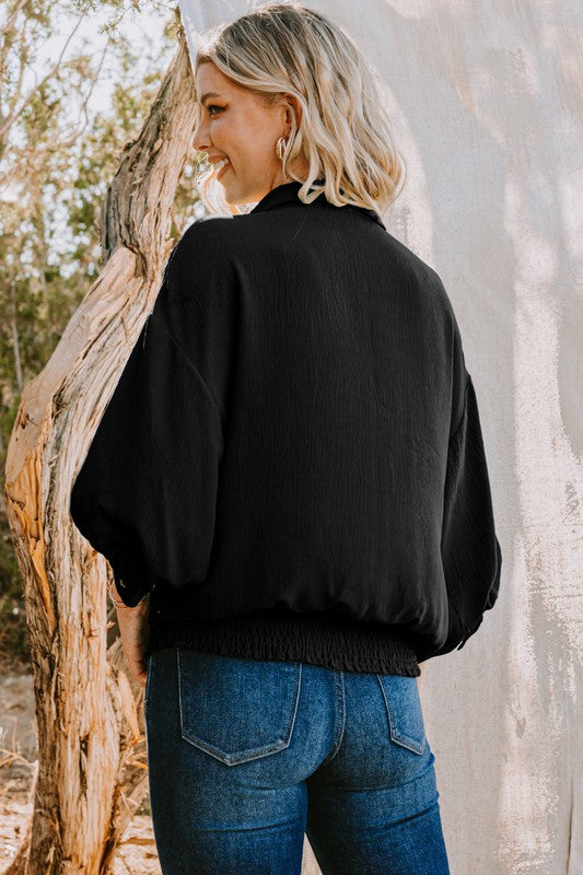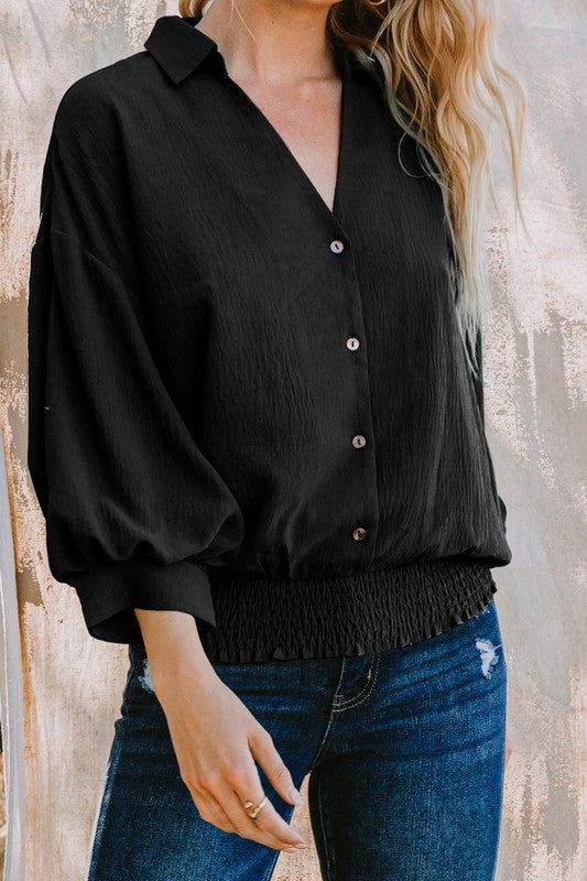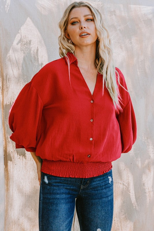 Elevate your wardrobe with this stylish solid woven shirt featuring elegant balloon sleeves and a flattering V-neckline. The front button-down design adds versatility, making it perfect for both casual and...