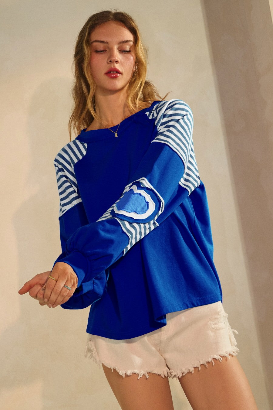 Allison Blue Striped 3/4 Embroidered Sleeves Top
