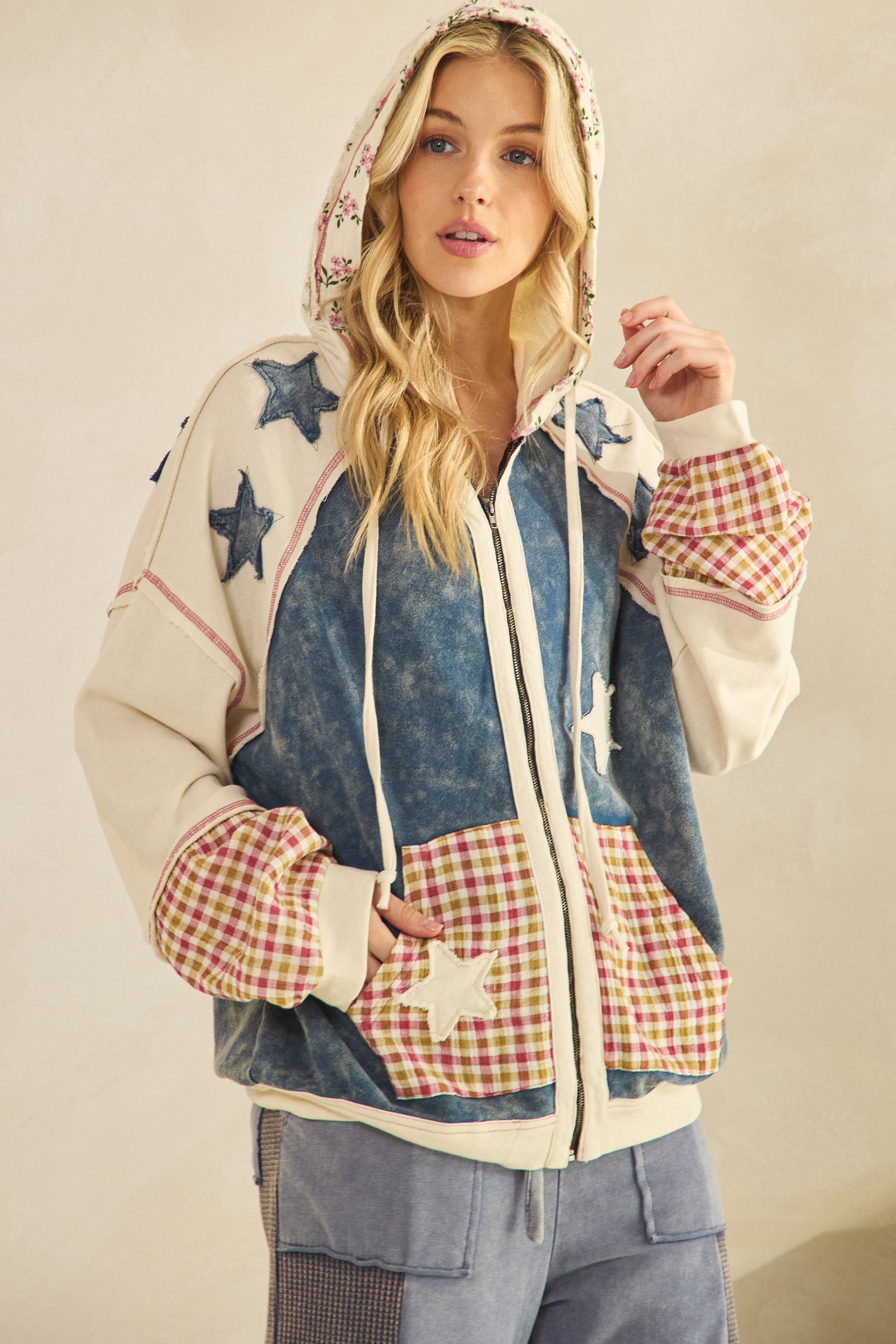 Experience cozy style with the Stargazer Zip Hoodie, crafted from soft 100% cotton French terry. Its relaxed, oversized fit pairs perfectly with unique denim-wash panels and raw-edge star appliques for...