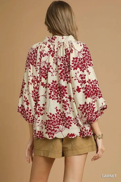 Experience effortless elegance with this Cherry Blossom Print Blouse. Featuring a flattering V-neckline and 3/4 balloon sleeves, its relaxed, flowy fit ensures comfort throughout the day. The scalloped hemline adds...