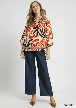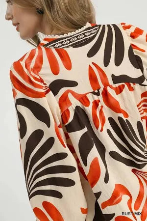 Discover the perfect blend of comfort and style with the Umgee Boho Print Leaf Blouse in Rust Mix. Its striking leaf print and warm rust tones create a trendy, boho-inspired...