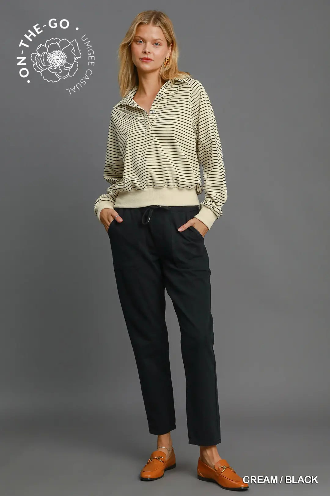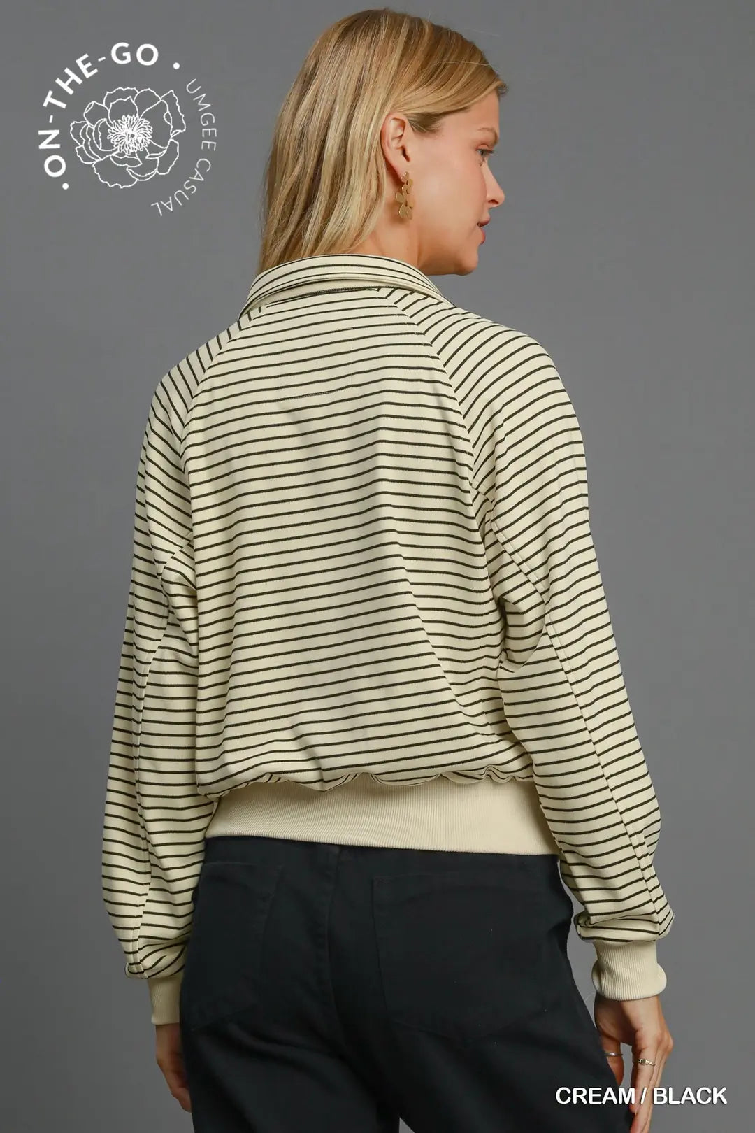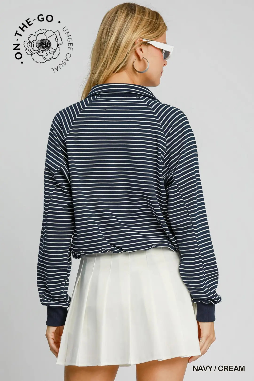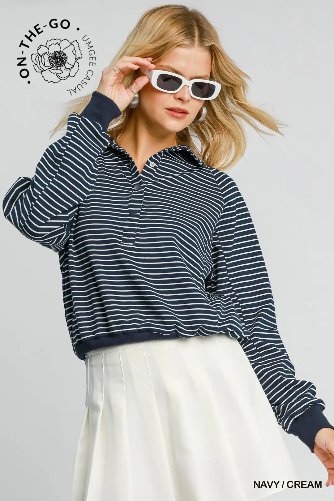 Stay stylish and comfortable in this Henley-style striped sweatshirt. Featuring slight balloon sleeves and a snap button closure, it adds a fashionable edge to classic sweatshirt material. Made from a...