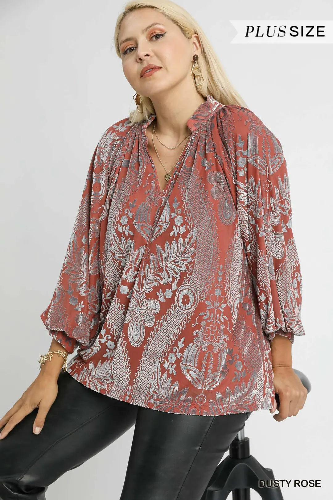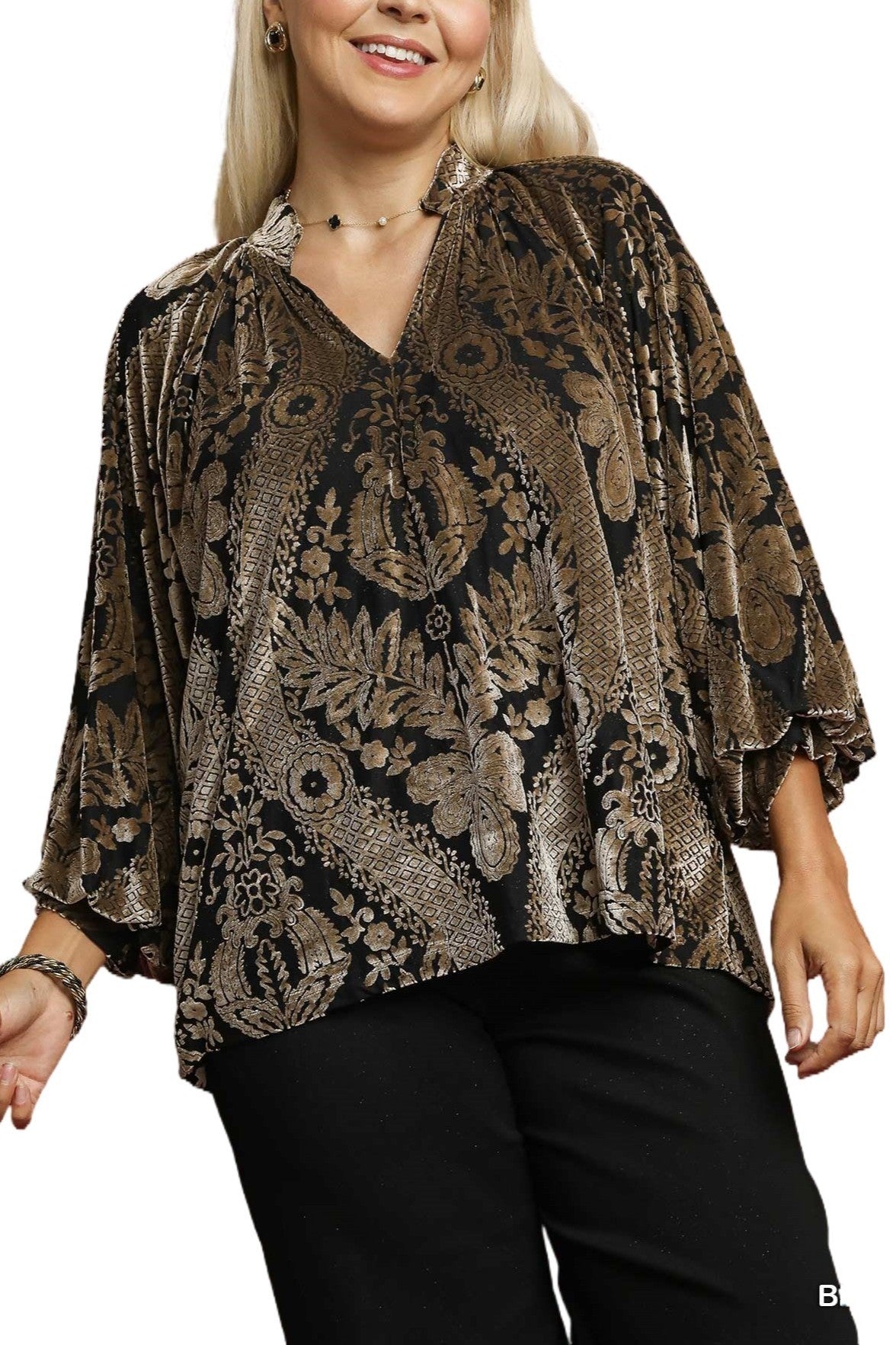 Experience timeless elegance with the Damask Print Velvet Split Neck Top. Made from a plush textured velvet blend, it offers both softness and visual richness. The split V-neck enhances femininity,...