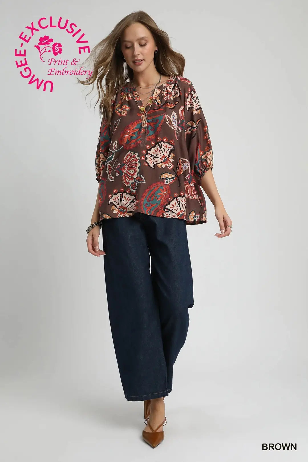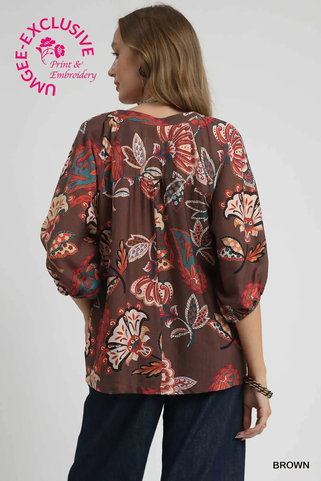 Embrace effortless style with this Boho Paisley Puff Sleeve Blouse. Featuring a flattering split neckline and charming mid-button detail, its 3/4 puff sleeves add a playful, feminine touch. Crafted from...