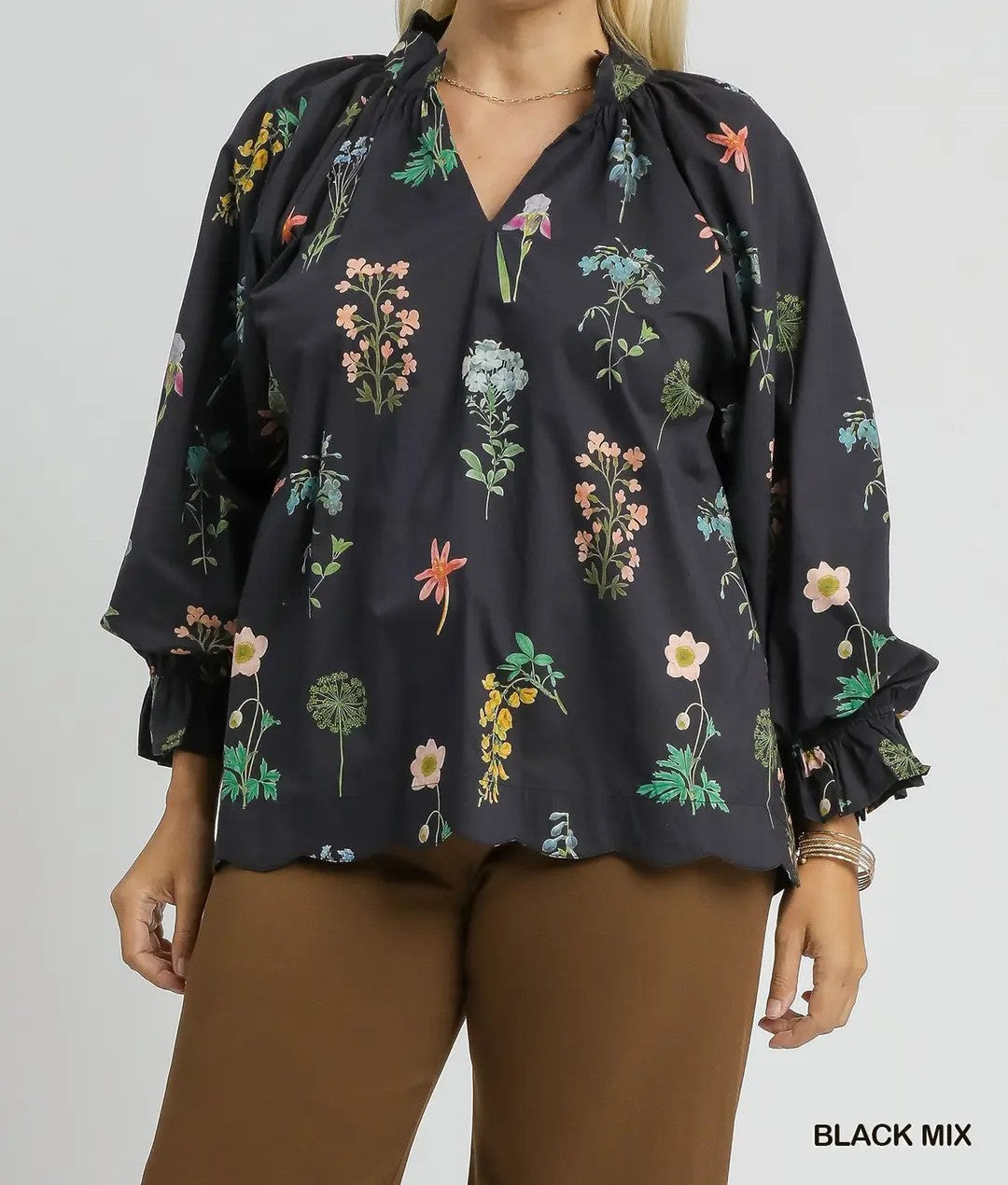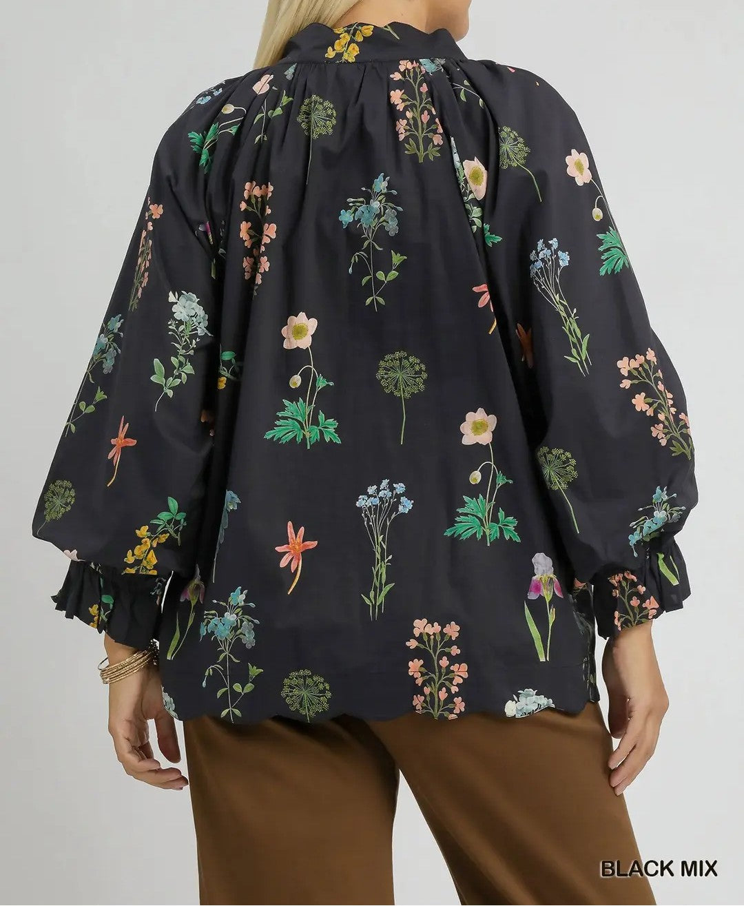 Brighten your look with the Floral Ruffle Neck Blouse, showcasing a delicate botanical garden print that adds natural charm. The ruffle mock neck with a front slit complements the elegant...