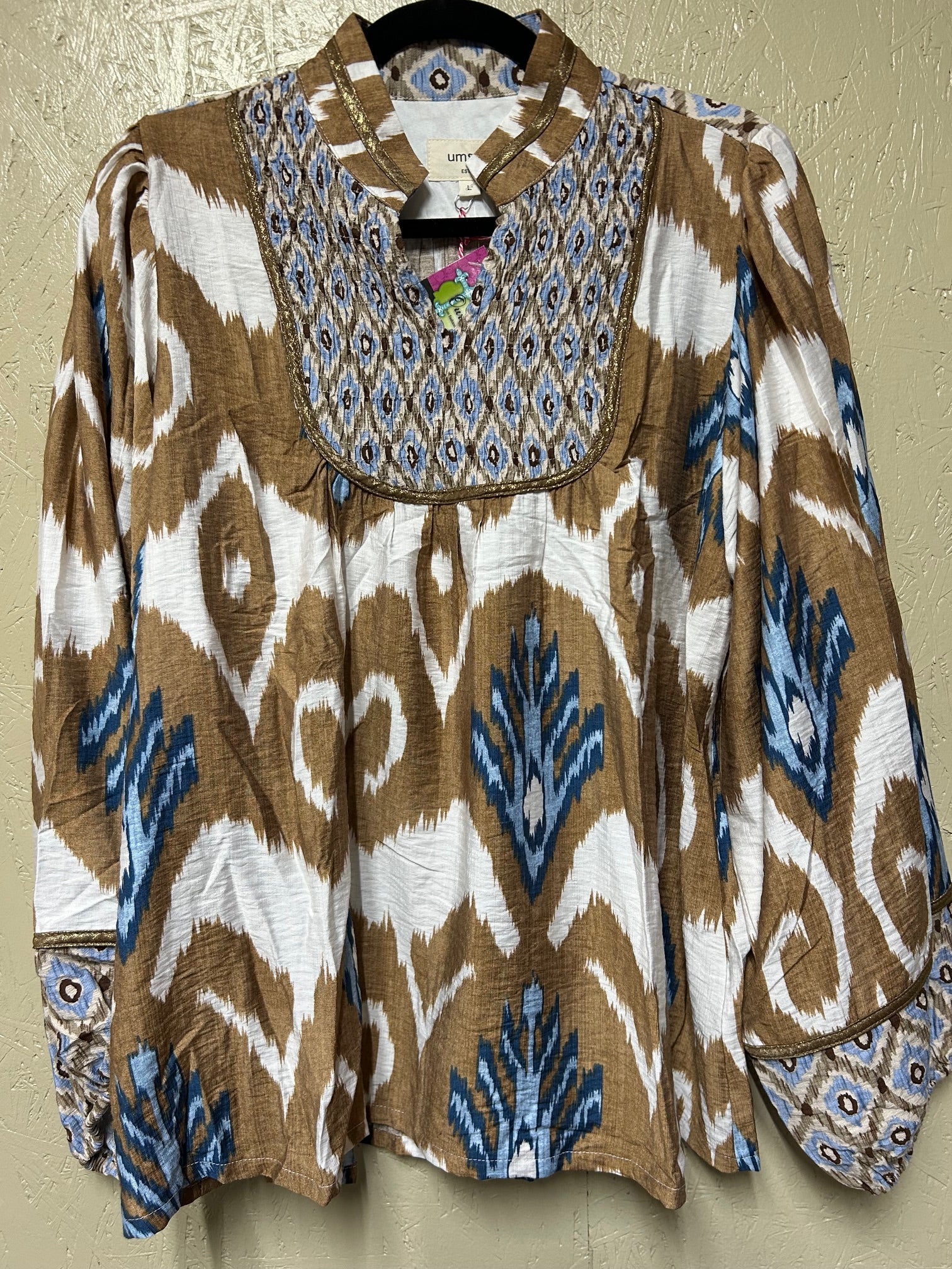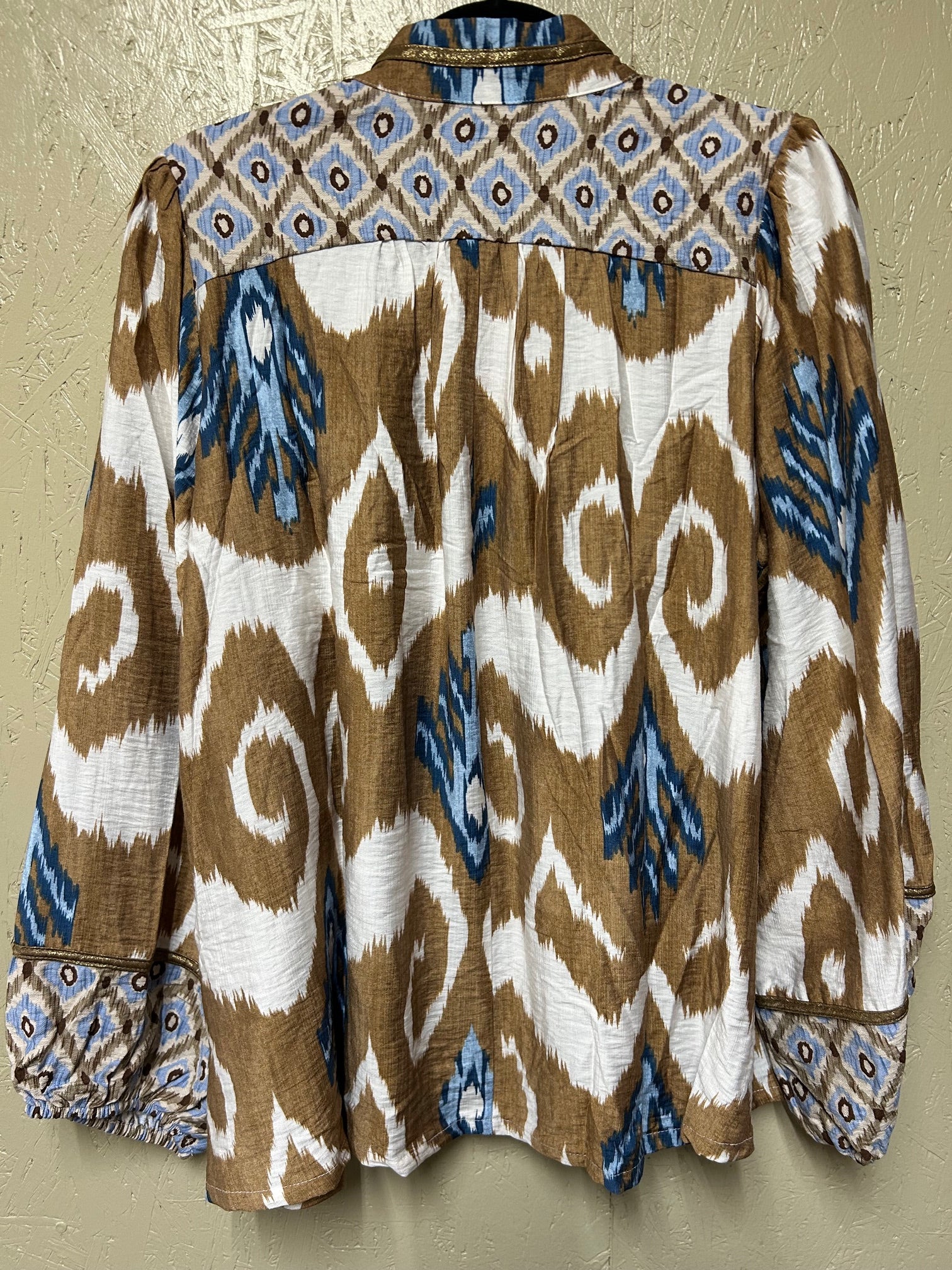 Discover effortless boho chic with this Ikat Print Boho Blouse. Designed with a bold ikat-inspired print, it features a flattering split neck and detailed yoke for a stylish look. The...
