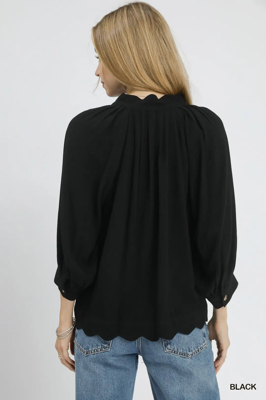 Embrace casual elegance with this Linen Scallop Hem Boho Blouse. The subtle V-neck and soft collar add a graceful touch, while 3/4 length sleeves with button tabs offer adjustable comfort....